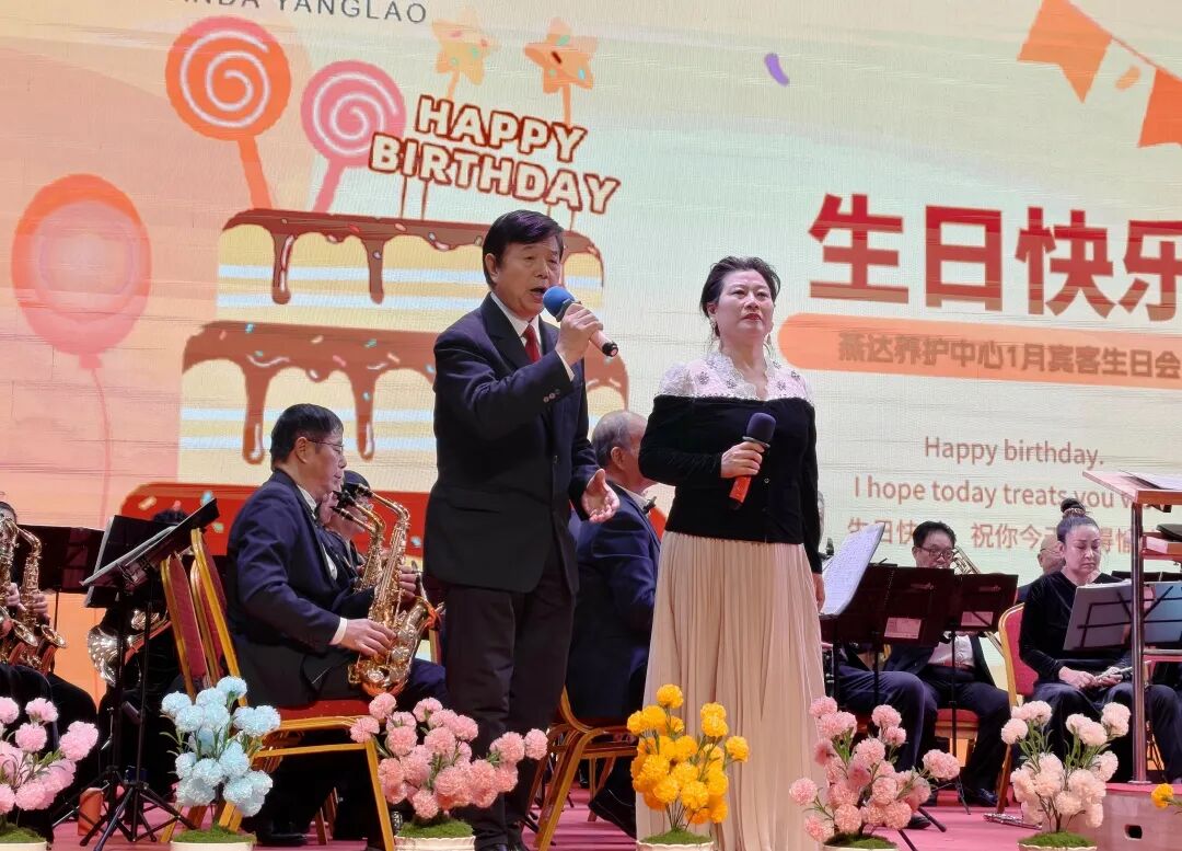 演出最后,全体演员共同登台,合唱《新年好》的歌声温馨动人,为长辈们送上了新年祝福,也为这场生日会画上了一个圆满的句号。